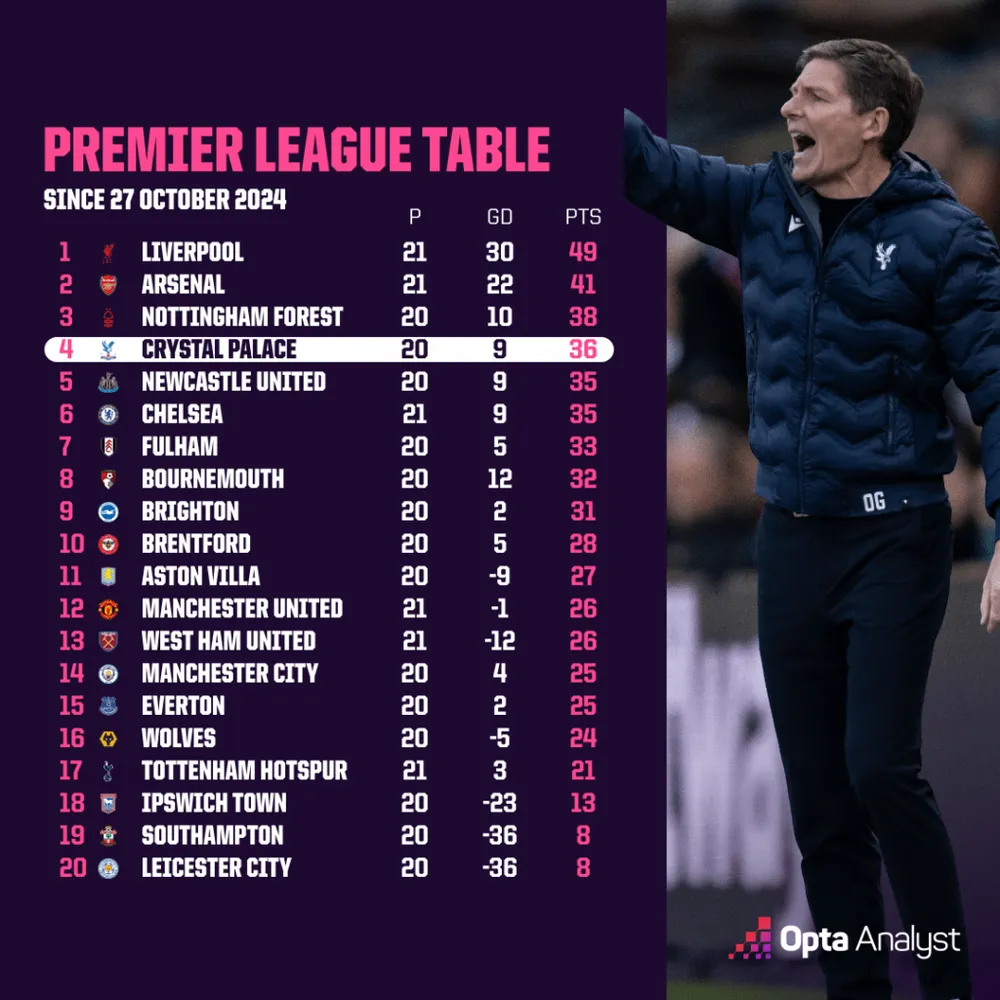 Cũng từ chiến thắng trước Spurs vào cuối tháng Mười, Palace đã giành được 36 điểm tại Premier League – chỉ Nottingham Forest (38), Arsenal (41) và Liverpool (49) giành được nhiều điểm hơn.