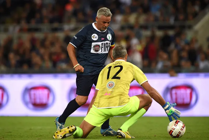 Roberto Baggio (trái) ghi bàn vào lưới thủ thành Toldo trong trận đấu gây quỹ từ thiện ở Rome.