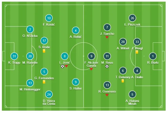 Dortmund bất ngờ sa lầy trên sân của Eintracht Frankfurt, nghẹn ngào bị cầm chân và buộc phải chia điểm với chủ nhà. Phút 22, Marco Reus lập công, đưa Dortmund vượt lên và phút 36, Jovic cân bằng tỷ số. Hòa 1-1, Dortmund cũng tăng cách biệt so với Bayern Munich, bởi trong trận đấu cùng giờ, "Hùm xám" bất ngờ thua 1-3 trước Leverkusen.