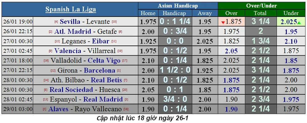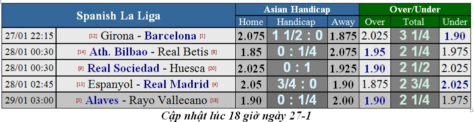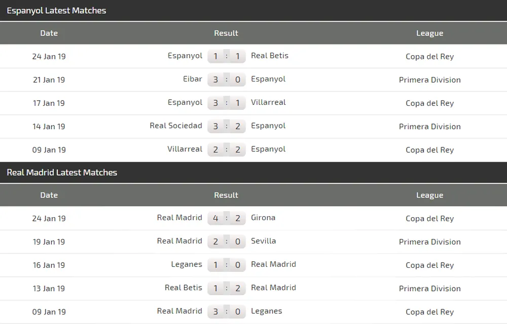 Đội quân của HLV Santiagoi Solari đang chơi tiến bộ hơn trước, bằng chứng là họ vừa thắng Sevilla 2-0 ở Liga rồi thắng tiếp Ginora 4-2 ở Cúp Nhà vua hôm giữa tuần. Ở Liga, Real Madrid cũng thắng 5 trong 7 trận dưới tay tân HLV Solari, song người ta vẫn nghi ngờ động lực của Kền kến trắng khi họ tụt lại sau đội đầu bảng Barcelona đến 10 điểm. Nếu Real Madrid không quyết tranh giành ngôi vô địch, họ có thể chọn trận đấu để… hòa. Biết đâu chừng đó là trận cầu dễ ăn nhất như trận gặp Espanyol.