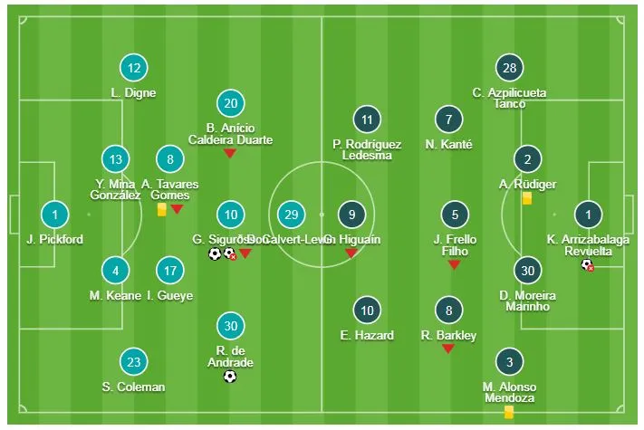 Dù sớm áp đảo chủ nhà Everton nhưng Chelsea phút 49, Everton mở tỷ số, Richarlison đánh đầu bồi trong tình huống phạt góc và Sigurdsson kịp lao vào đá bồi từ pha sút hỏng 11m của Sigurdsson để nâng tỷ số 2-0. Thua trận, Chelsea đứng thứ 6 với 57 điểm, kém MU ở vị trí thứ 5 chỉ 1 điểm và cách Arsenal ở vị trí thứ Tư 3 điểm.