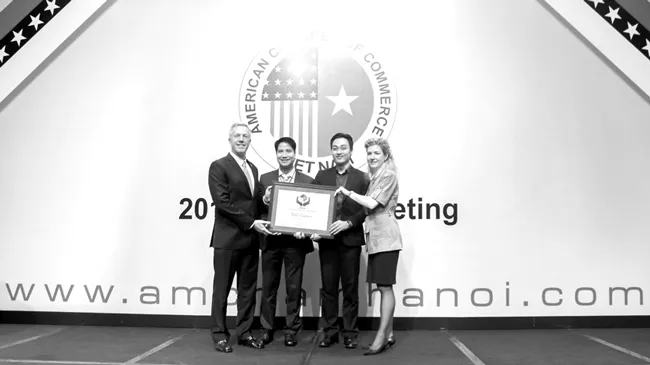 Ông Ted Osius (trái), Đại sứ Mỹ tại Việt Nam và bà Natasha Ansell, Phó Chủ tịch Hiệp hội Thương mại Hoa Kỳ, trao giải thưởng CSR 2016 cho lãnh đạo FedEx Việt Nam.