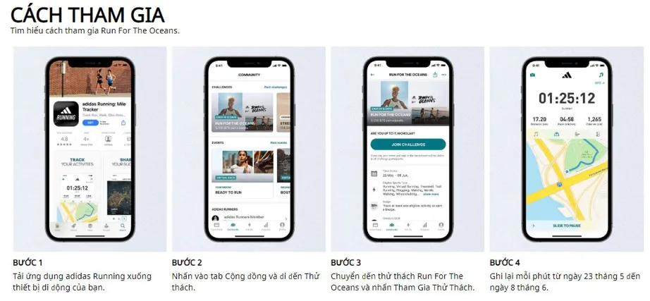 Hãy tham gia vào cộng đồng những người chạy vì đại dương ngay hôm nay và trở thành thế hệ đồng hành chấm dứt rác thải nhựa từ ngày 23/05 đến ngày 08/06 bằng cách đăng ký và ghi lại số phút chạy của bạn qua ứng dụng adidas Running.
