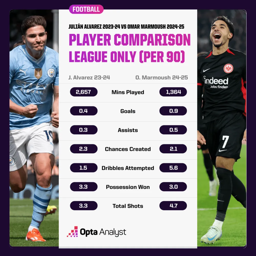So sánh thành tích của Marmoush mùa này với Alvarez tại Man City mùa trước, cầu thủ người Ai Cập trung bình có nhiều cú sút hơn mỗi 90 phút so với cầu thủ người Argentina (4,7 so với 3,3) và nhiều pha rê bóng hơn đáng kể mỗi 90 phút (5,6 so với 1,5). Anh gần như ngang bằng với số cơ hội tạo ra mỗi 90 phút của Alvarez (2,1 so với 2,3) và cũng gần như giành được quyền kiểm soát bóng thường xuyên (3,0 so với 3,3). Tuy nhiên, mỗi số liệu có thể thay đổi trong một hệ thống khác nhau với những yêu cầu khác nhau.