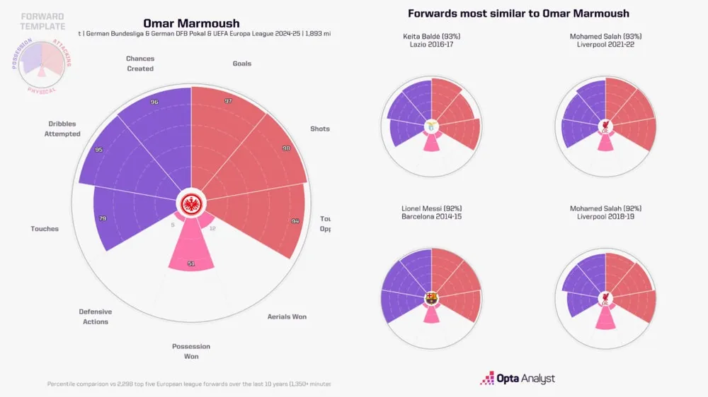 Marmoush cũng đưa ra một số kết quả thú vị trong công cụ Player Similarity của Opta , công cụ này xem xét thành tích của gần 2.300 cầu thủ từ năm giải đấu hàng đầu châu Âu trong 10 năm qua. Mặc dù công cụ này không đo lường tất cả các số liệu, nhưng những số liệu mà công cụ này đưa vào cho thấy thành tích của anh ấy trong mùa giải 2024-25 gần giống nhất với hai trong số những mùa giải hay nhất của Salah tại Liverpool, cũng như chiến dịch 2014-15 của Messi.