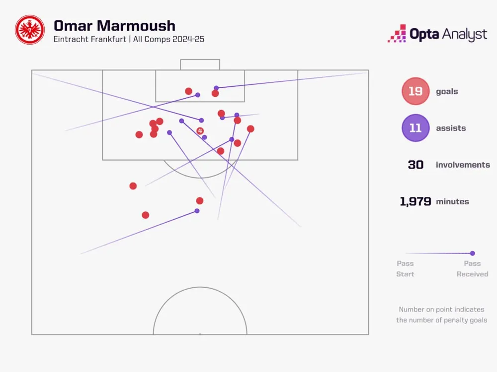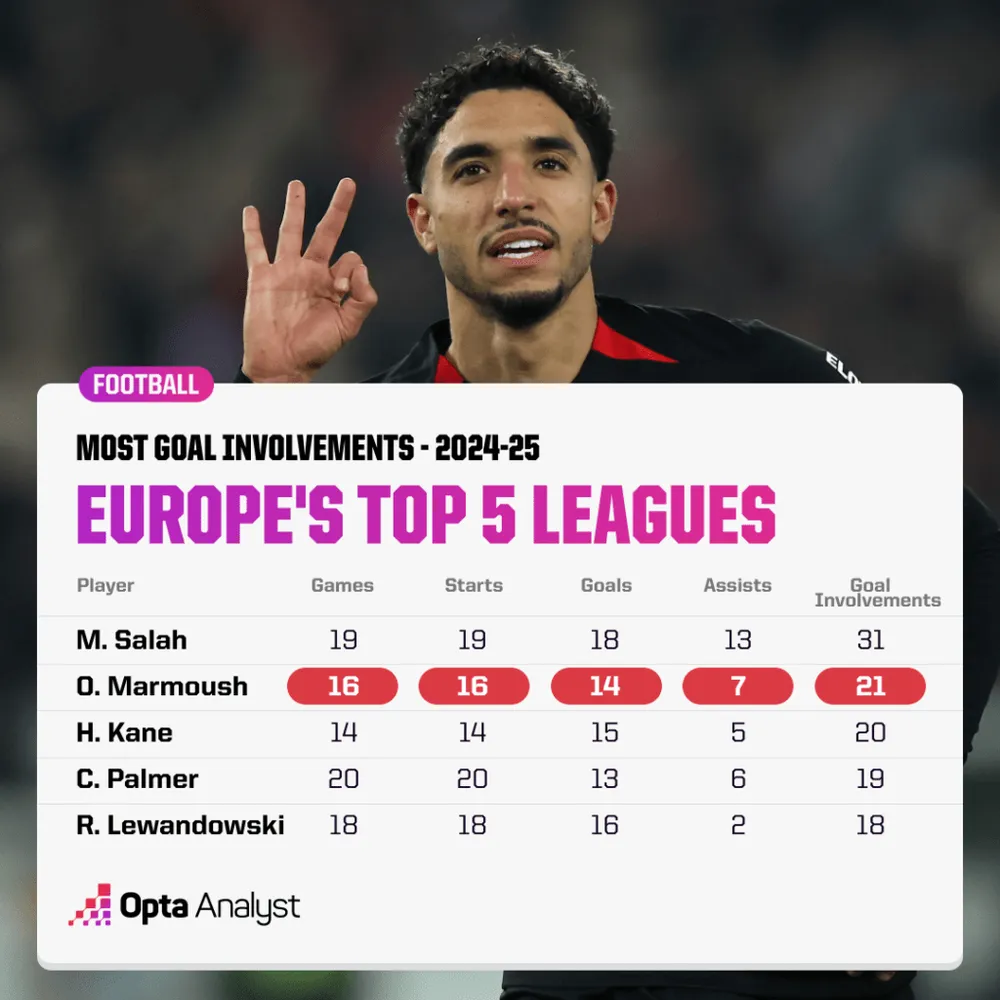 Trong mọi giải đấu, chỉ có Salah (38) có nhiều hơn 30 bàn thắng của Marmoush so với các cầu thủ ở năm giải đấu hàng đầu châu Âu, trong khi ngôi sao của Eintracht cũng chỉ đứng sau đội trưởng đội tuyển quốc gia của mình khi chỉ xét đến các trận đấu giải đấu. 21 bàn thắng của anh ấy đã vượt qua Harry Kane (20), Cole Palmer (19), Robert Lewandowski (18), Alexander Isak, Raphinha và Erling Haaland (tất cả đều là 17).