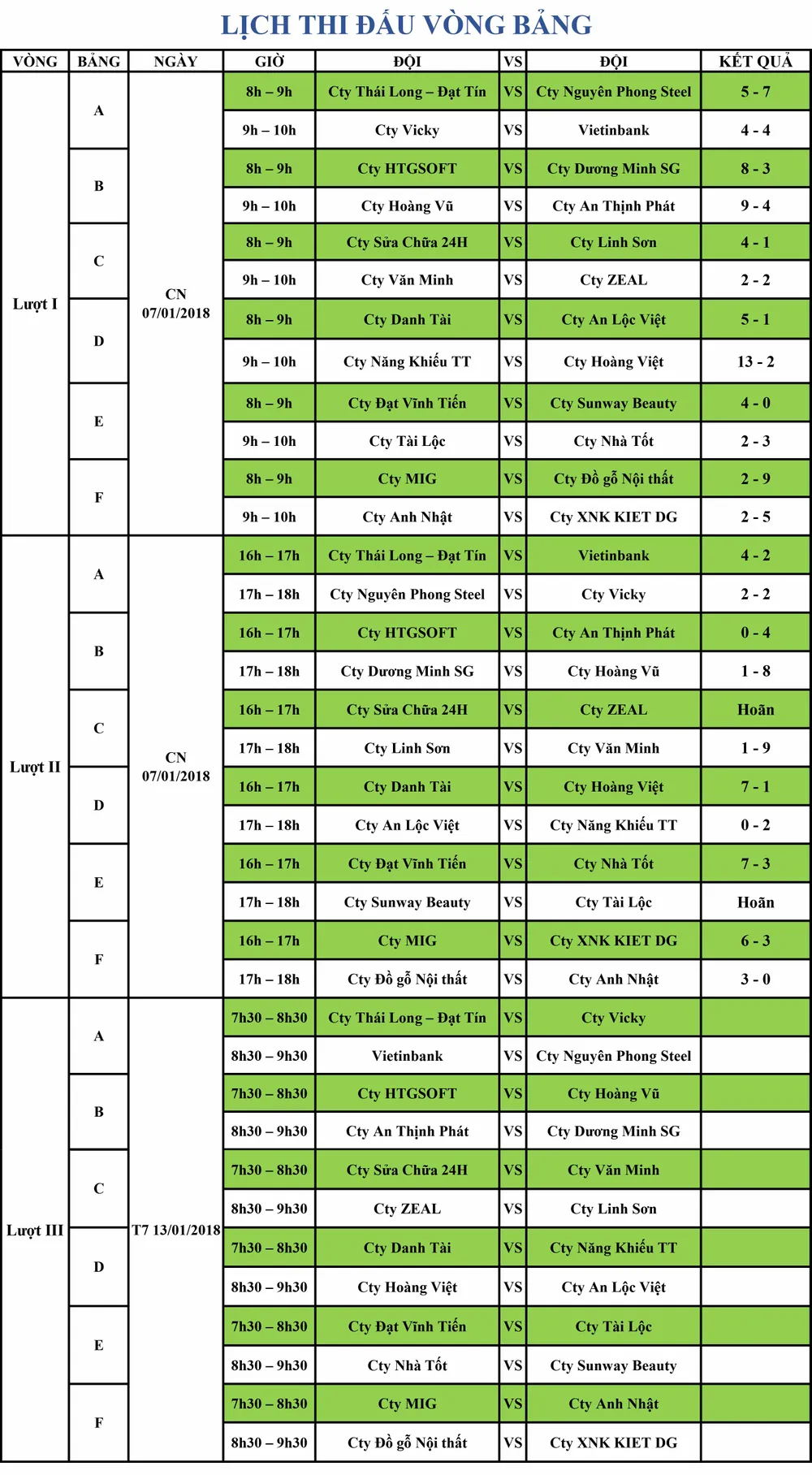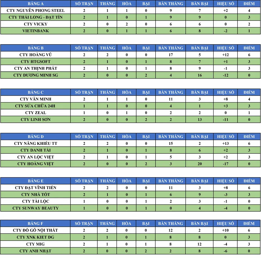 Ở bảng D, đội bóng công ty Năng khiếu Thể thao cũng sở hữu 15 bàn thắng trong ngày ra quân. Đội bóng này lần lượt vượt qua các đối thủ công ty Hoàng Việt với tỷ số 13-2, công ty An Lộc Việt với tỷ số 2-0. Bảng F, Đồ gỗ Nội Thất Thiên Vương cũng đã bỏ túi 12 bàn thắng bằng 2 trận thắng công ty MIG tỷ số 9-2 và công ty Anh Nhật 3-0 và tạm dẫn đầu bảng F.