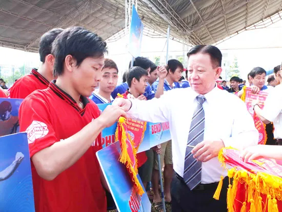 Ông Nguyễn Văn Hùng (phải)-Chủ tịch HĐQT Becamex IDC trao cờ lưu niệm cho các đội. Ảnh: Minh Bảo