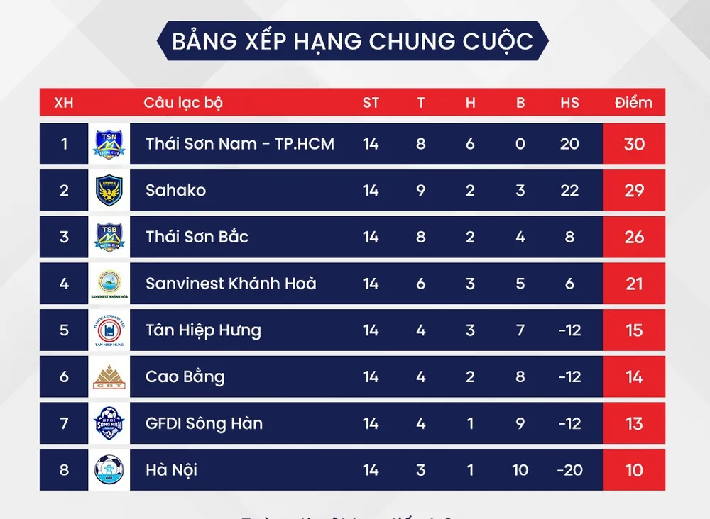 Thái Sơn Nam TPHCM lên ngôi với thành tích bất bại, khi có 8 chiến thắng và hòa 6 trận, giành tổng số điểm 30. Các học trò của HLV Nguyễn Trọng Thiện sở hữu hàng thủ tốt nhất giải đấu, khi chỉ để thủng lưới 18 bàn thua. Nhờ điều này đã giúp tuyển thủ Hồ Văn Ý của CLB đoạt danh hiệu Thủ môn xuất sắc nhất giải đấu. Trong khi đội phó Phạm Đức Hòa được bầu chọn cho danh hiệu Cầu thủ xuất sắc nhất giải đấu.