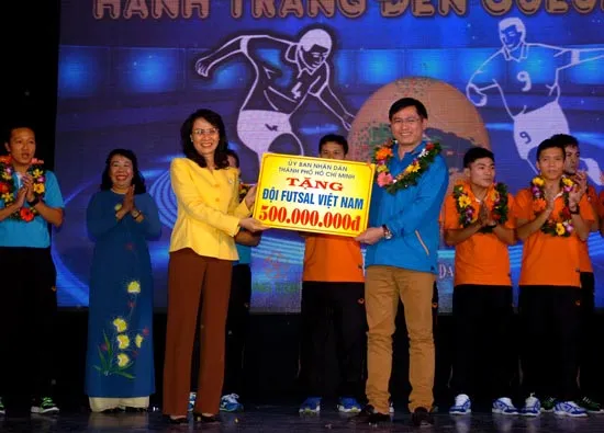 Các ông, bà Nguyễn Thị Thu - Thành ủy viên, Phó Chủ tịch UBND TPHCM, Phạm Đức Hải - Thành ủy viên, Phó trưởng Ban Thường trực Ban Tuyên giáo Thành ủy, Thi Thị Tuyết Nhung - Trưởng ban Văn hóa-Xã hội HĐND TPHCM, Mai Bá Hùng - Phó Giám đốc Sở Văn hóa và Thể thao, Trần Anh Tú - Chủ tịch Liên đoàn Bóng đá TPHCM, Lâm Đình Thắng - Phó Bí thư Thường trực Thành đoàn, Phạm Đăng Khương - Phó Giám đốc Nhà Văn hóa Thanh Niên… đã đến tham dự. Nhân dịp này, Phó Chủ tịch Nguyễn Thị Thu đã thay mặt UBND TPHCM trao tặng cho đội tuyển futsal Việt Nam 500 triệu đồng.