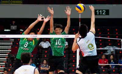 Chủ công Nguyễn Văn Hạnh (giữa) có sức bật “siêu khủng” và luôn cháy hết mình trên sàn đấu Ảnh: T.L