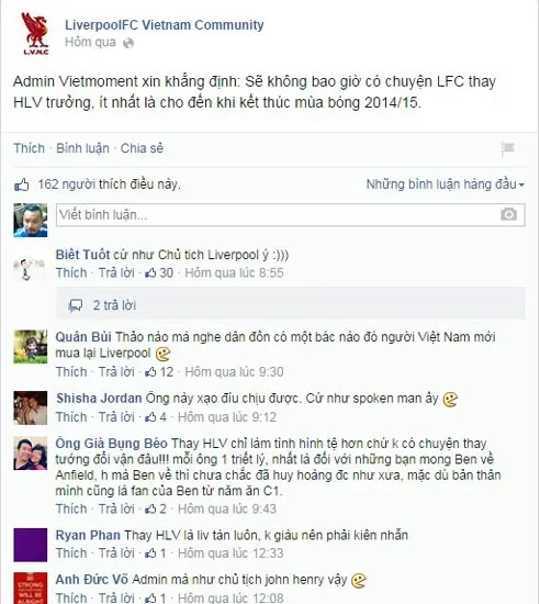 Tối hôm 7-11, Admin Vietmoment của Fan Page LiverpoolFC Vietnam Community (L.V.N.C) đã cho đăng tải một thông tin đầy tự tin, cực chất và rất… tỉnh, đó là: “Admin Vietmoment xin khẳng định: “Sẽ không bao giờ có chuyện LFC thay HLV trưởng, ít nhất là cho đến khi kết thúc mùa bóng 2014-2015”. Thông tin này ngay lập tức đã làm dậy sóng cộng đồng mạng ủng hộ Lữ đoàn đỏ ở Việt Nam. Nhiều người đã bật cười với những bình luận phản hồi đại loại như: “Vâng, và người Việt Nam đã mua lại Liverpool!”, “Bác Henry (sáng lập viên của Tập đoàn Fenway Sports, đơn vị đang sở hữu Liverpool) còn chưa dám nói chắc như vậy, nhưng anh rất tỉnh và rất… đẹp trai đã đoan chắc”.