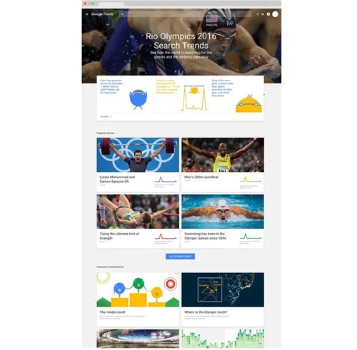 Google Trends mang đến cho bạn khung cảnh độc đáo với Google Trends mới dành riêng cho Olympic. Tại đây, bạn có thể biết được những vận động viên, môn thi và khoảnh khắc nào đang thu hút người xem và được tìm kiếm nhiều nhất trên toàn thế giới. Chẳng hạn như, Thụy Sỹ là quốc gia được tìm kiếm thông tin về bóng chuyền bãi biển nhiều nhất. Và tên người bà được tìm kiếm nhiều nhất trên thế giới đã thuộc về bà của vận động viên bơi lội nước Anh- Adam Peaty.