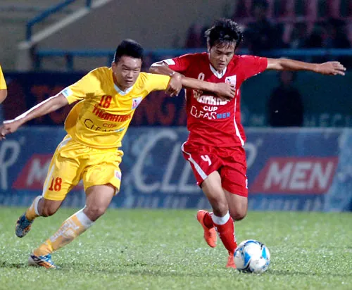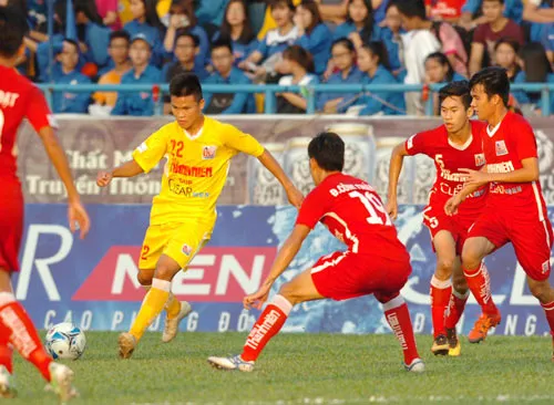 Tuấn Hải (số 22) tung cú sút trước hàng phòng ngự Sanna Khánh Hòa