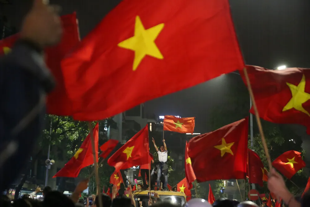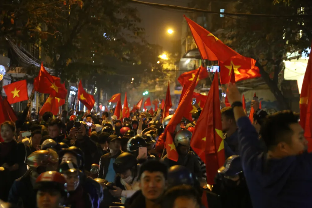 Ngay khi tiếng còi kết thúc hơn 120 phút trận đấu vừa dứt, người dân Hà Nội với cờ đỏ sao vang đã đổ ra đường ăn mừng chiến thắng.