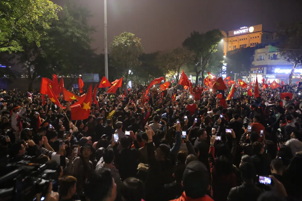 Tại khu vực ngã tư Hàng Bài, Hai Bài Trưng và xung quanh phố đi bộ Hồ Gươm không còn một chỗ trống, tất cả đều trong biển người cờ và xe cùng vời những tiếng hô vang không dứt chúc mừng chiến thắng của các cầu thủ trẻ Việt Nam.