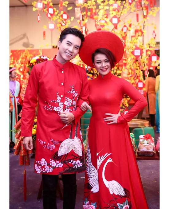 Xuất hiện trên thảm đỏ của một sự kiện nổi bật vào tối ngày 10-2, ca sĩ Nguyễn Hải Yến và MC Minh Toàn gây thu hút sự chú ý khi chọn áo dài hình hoa đào, chim hạc của NTK Brian Võ. Đây là bộ áo dài đôi của NTK Brian Võ, một nhà thiết kế khá nổi tiếng ở Việt Nam và là NTK “độc quyền” về áo dài của danh hài Hoài Linh.