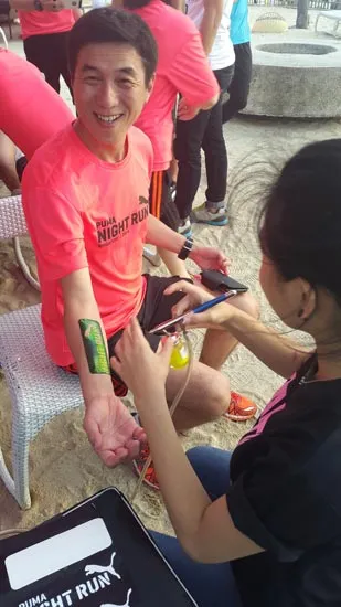 Chiều 1-11, cùng với hơn 3.000 thành viên đăng ký Night Run, chúng tôi làm thủ tục nhập đoàn đua, nhận áo, khăn và vòng lân tinh phát sáng trong đêm.