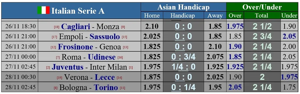 Inter Milan chỉ hơn Juventus có 2 điểm nên chỉ cần giành thắng lợi trên sân nhà thì đội bóng của HLV Max Allegri sẽ chiếm lấy ngôi đầu sau 13 vòng đấu. Được chơi trên sân nhà Allianz là một lợi thế nhưng khoan thủng hàng thủ Inter Milan không phải chuyện đơn giản. Trong 5 trận sân khách ở Serie A mùa này, Inter Milan toàn thắng cả 5 và chỉ để thủng lưới có 1 lần. Tính hết 12 vòng đấu ở giải Serie A, Inter Milan cũng chỉ mới để thủng lưới có 6 bàn.
