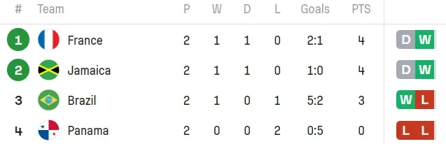 Chiến thắng Brazil đã đưa Pháp lên ngôi đầu bảng để lọt vào vòng knock-out trong kỳ World Cup thứ tư liên tiếp. Pháp chỉ cần 1 điểm ở Sydney vào thứ Tư là đủ để vượt qua vòng bảng. Họ thậm chí có thể đi tiếp nếu thua, với điều kiện Jamaica đánh bại Brazil ở trận đấu còn lại của bảng F.