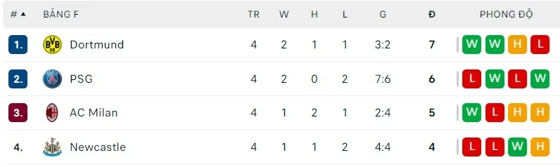 Borussia Dortmund đang gặp chút khó khăn về thành tích ở Bundesliga nhưng đang chiếm ngôi đầu bảng F ở Champions League. Vàng đen có được 7 điểm sau 4 trận, hơn đại gia PSG 1 điểm, hơn AC Milan 2 điểm. Như vậy, chỉ cần giành chiến thắng trước chủ nhà AC Milan ở lượt trận thứ 5 thì Dortmund chắc chắn có suất dự vòng knock out. Bằng không, Dortmund sẽ còn phải chờ đợi kết quả của trận đấu còn lại giữa PSG với Newcastle United.