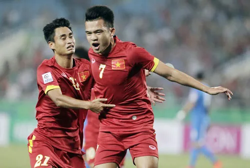Hoàng Thịnh mừng bàn thắng cùng Hà Minh Tuấn (trái) sau cú ghi bàn đẹp mắt vào lưới Phillipines tại AFF Cup 2014. Ảnh: Minh Hoàng