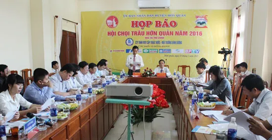 Ngày 15-1, UBND huyện Hớn Quản (tỉnh Bình Phước) đã tổ chức buổi họp báo thông tin về Hội chọi trâu Hớn Quản năm 2016 (ảnh) - diễn ra lúc 7 giờ 30 ngày 16-2-2016 (nhằm mùng 9 tháng Giêng năm Bính Thân), tại sới chọi trâu ấp 5, xã Tân Khai.