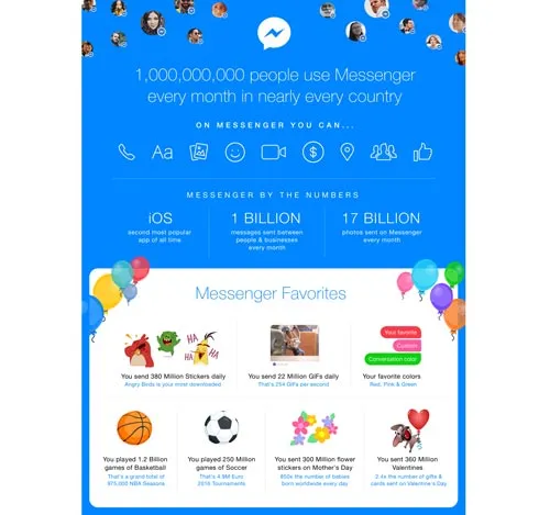 + Hơn 250 bộ sticker trên Messenger, bao gồm hơn 40.000 sticker. Và hơn 380 sticker được gửi đi mỗi ngày.