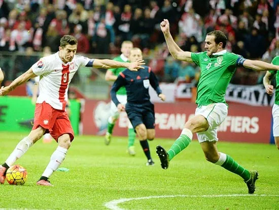Robert Lewandowski (trái) trung cú sút trường hàng phòng ngự CH Ailen.