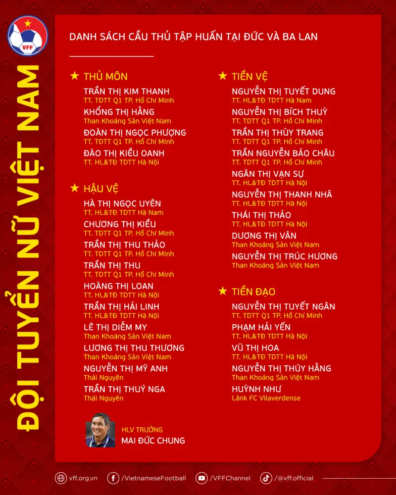 Trước khi bắt đầu chuyến tập huấn tại châu Âu để chuẩn bị cho VCK bóng đá nữ thế giới 2023, HLV Mai Đức Chung và các cộng sự đã đưa ra danh sách rút gọn gồm 28 cầu thủ sẽ tiếp tục đồng hành cùng đội tuyển nữ Việt Nam.