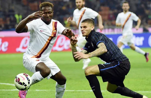 Mauro Icardi (phải, Inter) cố gắng vượt qua Yanga-Mbiwa (Roma).