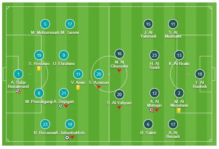 Phút thứ 3, Ahmed Kano bỏ qua cơ hội ghi bàn trên chấm 11m, bỏ lỡ cơ hội giành vé và phía Iran có Jahanbakhsh, Dejagah dễ dàng ghi 2 bàn. Thắng dễ Oman 2-0, Iran ghi danh vào tứ kết Asian Cup 2019 và gặp đối thủ tiếp theo là Trung Quốc.