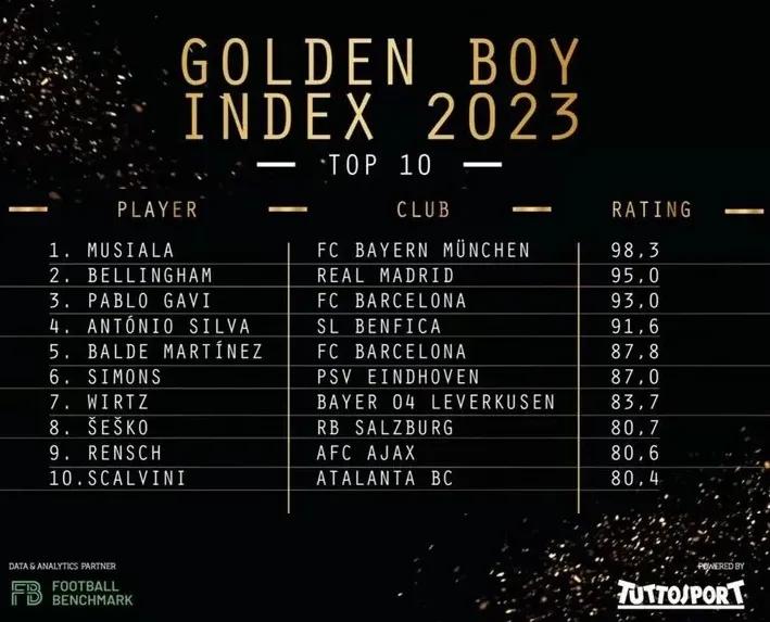 Bảng xếp hạng Golden Boy Index đưa ra thông số và xếp hạng 100 cầu thủ trẻ, chỉ những cầu thủ sinh từ ngày 1-1-2003 mới được xem xét. Điều này có nghĩa là không có ai đủ 21 tuổi trong năm 2023. Bảng xếp hạng năm nay dựa trên dữ liệu các trận đấu diễn ra từ khi bắt đầu World Cup 2022 ở Qatar đến ngày 4-6-2023.