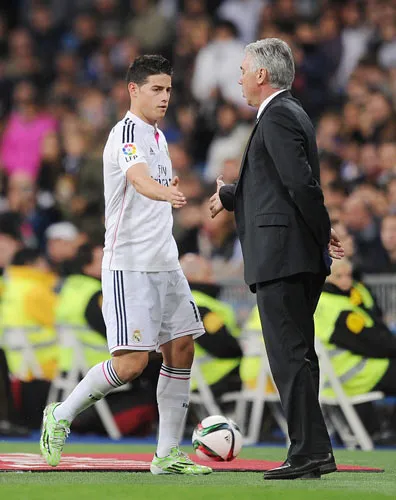 James Rodriguez (trái) và HLV Carlo Ancelotti.