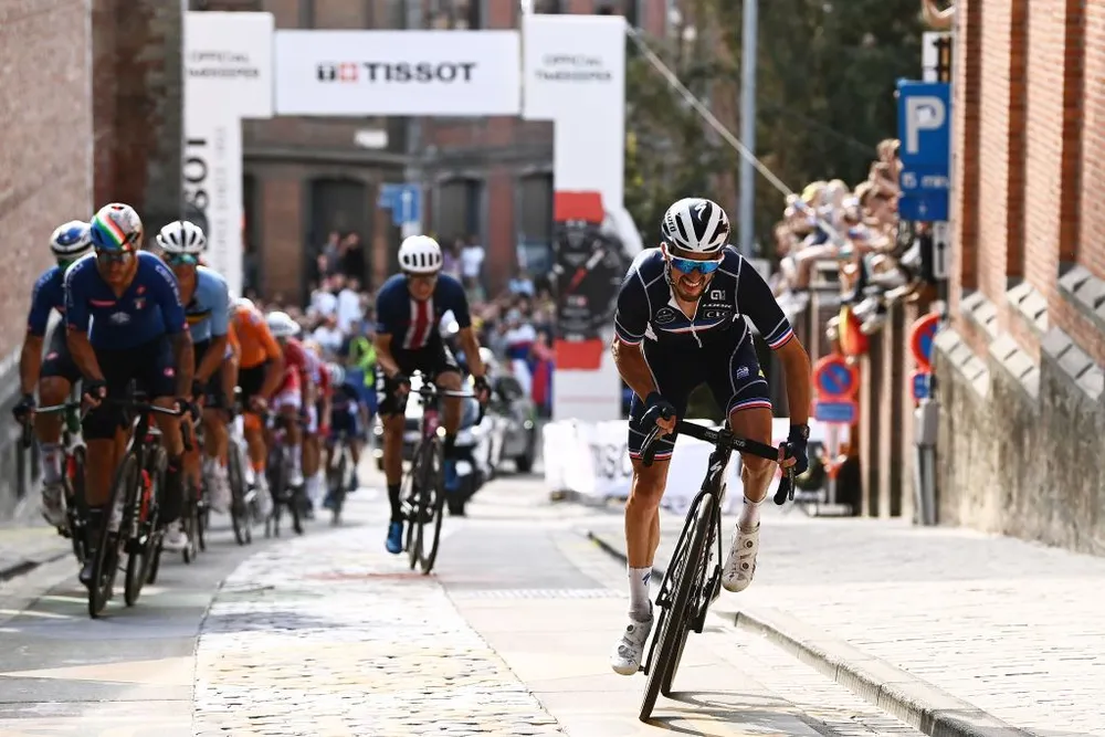 Đến lúc này, Pháp đã bắt đầu tấn công. Đầu tiên là Anthony Turgis rồi Julian Alaphilippe nhưng đã bị giữ lại. Sau đó, Benoît Cosnefroy (Pháp) lôi Remco Evenepoel (Bỉ) và Magnus Cort (Đan Mạch) thoát đi. Thay vì rượt đuổi, nhóm đông phía sau lại hỗn loạn với những đợt tấn công mới và nhóm mới gồm Kasper Asgreen (Đan Mạch), Brandon McNulty (Mỹ), Pascal Eenkhoorn (Hà Lan), Arnaud Démare (Pháp), Primož Roglič (Slovenia), Ben Swift (Anh), Imanol Erviti (Tây Ban Nha), Bissegger, Nathan Haas ( Úc), Jan Tratnik (Slovenia) và Markus Hoelgaard (Na Uy)… đã thoát đi đuổi kịp Cort, Cosenfroy và Evenepoel.