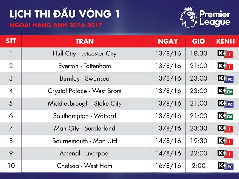 Truyền hình Số vệ tinh Việt Nam- VSTV (K+) vừa thông báo việc phát sóng giải bóng đá Ngoại hạng Anh (English Premier League- EPL) mùa 2016-2017, khởi tranh vào 18 giờ 30 hôm nay 13-8.
