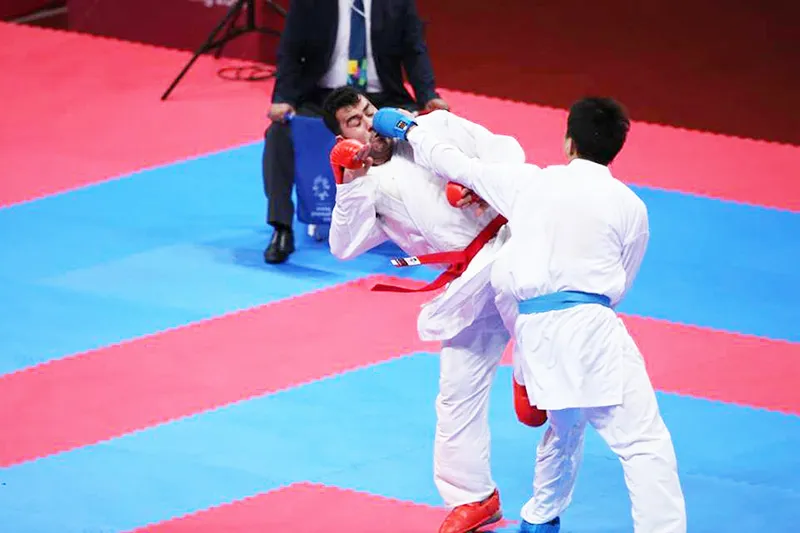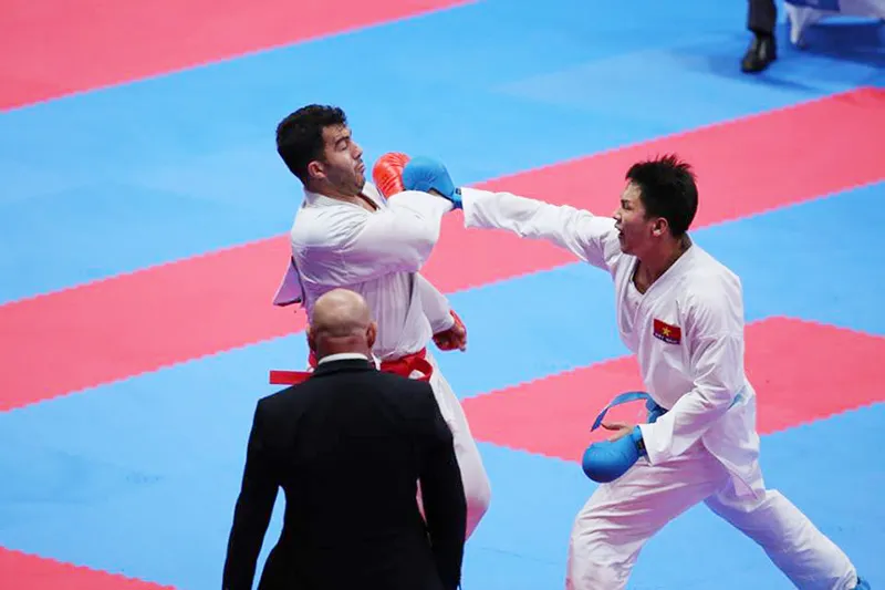 Minh Phụng (đai xanh) ra đòn trúng mặt võ sĩ Iran. Ảnh: DŨNG PHƯƠNG