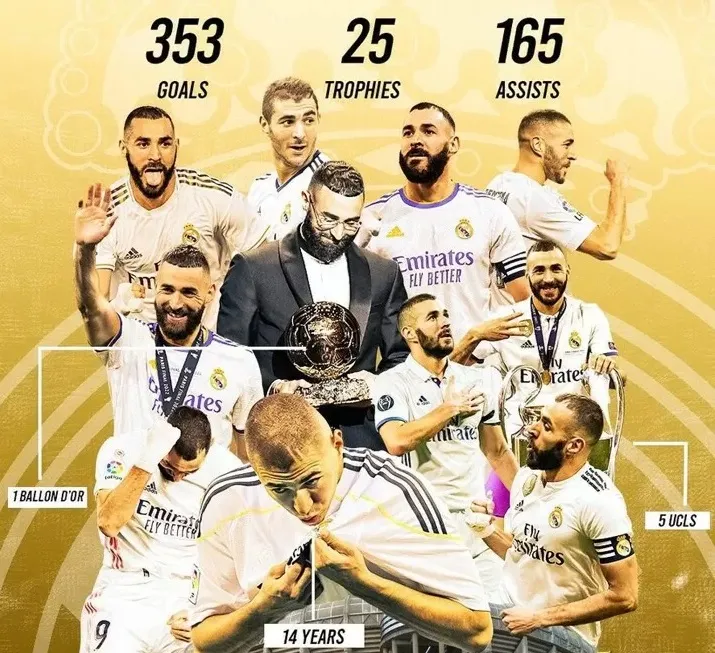 Benzema đã chơi 647 lần cho Madrid và trong hơn một thập kỷ ở thủ đô Tây Ban Nha, anh đã trở thành cầu thủ ghi bàn nhiều thứ hai cho CLB với 353 bàn thắng.