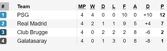Cùng lúc đó, ở trận còn lại của bảng này, Paris Saint-Germain thắng Club Brugge 1 - 0. Như vậy, sau 4 trận toàn thắng, đội bóng của nước Pháp giành quyền vào vòng sau.