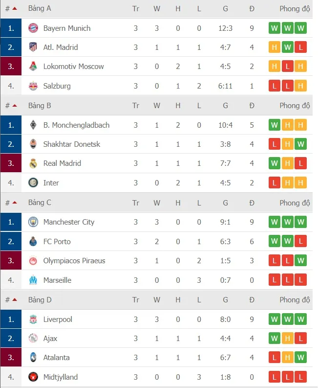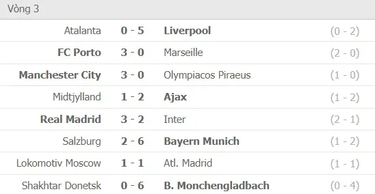 Vòng 3 khởi đầu ở các bảng A,B,C,D diễn ra rạng sáng nay với chiến thắng đậm đà của những đội bóng lớn khi Liverpool, Man City và Bayern Munich đều dễ dàng đánh bại những đối thủ kém danh, trong lúc Real Madrid chỉ vượt qua kình địch Inter ở phút chót.