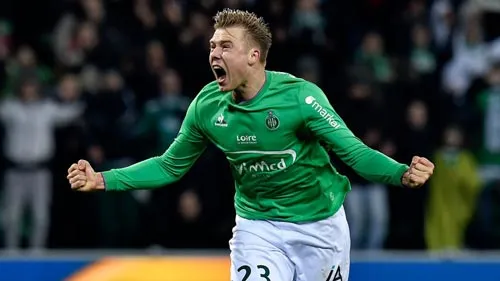 Alexandre Solderlund (St Etienne) ăn mừng bàn thắng trong trận derby với Lyon.