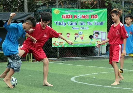 Sáng 24-6, tại sân bóng mini Khu vui chơi Khánh Hội, Ban Thường vụ Quận đoàn 4 TPHCM tổ chức lễ khai mạc Giải bóng đá “Chắp cánh ước mơ xanh” năm 2015 cho hơn 200 thanh thiếu niên có hoàn cảnh khó khăn trên địa bàn quận (ảnh). Giải thu hút 16 đội đến từ 15 phường và được tổ chức theo hình thức đấu loại trực tiếp, xác định đội vô địch.
