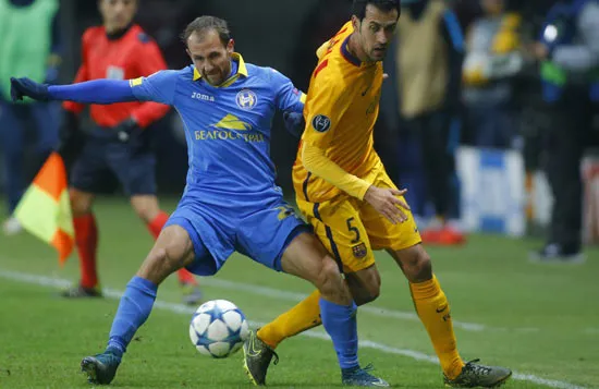 Busquets (phải, Barcelona) thoát khỏi sự đeo bám của Stasevich (Bate).