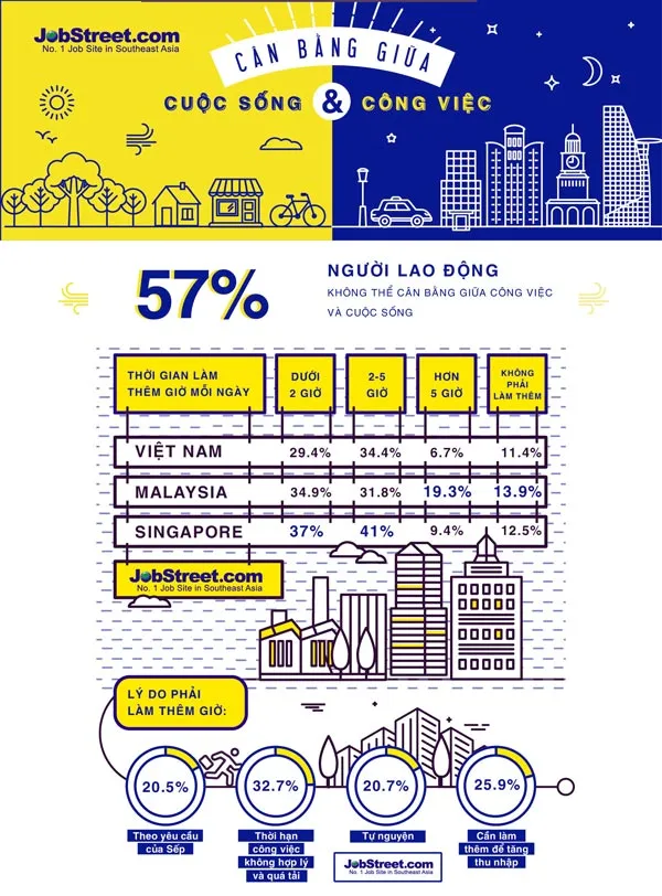 Để tìm hiểu rõ hơn liệu người lao động có đang quá tải với công việc, đồng thời đưa ra giải pháp phù hợp để doanh nghiệp thu hút và giữ nhân tài, JobStreet.com Việt Nam, mạng việc làm hàng đầu Đông Nam Á, tiếp tục thực hiện một khảo sát gần 5.500 người lao động về thời gian làm việc hàng ngày, sự can thiệp của công việc vào đời sống cá nhân, khối lượng công việc cũng như những chính sách mà người lao động đang nhận được để đảm bảo sự cân bằng giữa công việc và cuộc sống.
