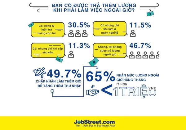 Dù nhiều người lao động chọn việc làm thêm giờ để cải thiện thu nhập, khảo sát của JobStreet.com Việt Nam cũng chỉ ra rằng gần 47% không được trả lương ngoài giờ kể cả khi họ làm những công việc mà sếp yêu cầu. Có 30% người lao động cho biết công ty luôn trả lương khi yêu cầu làm thêm ngoài giờ, 22% cho biết chỉ được trả lương ngoài giờ khi sếp có yêu cầu hoàn thành công việc.
