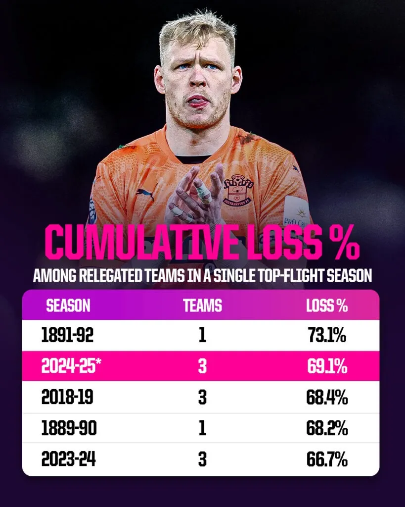 Tổng cộng, họ đã thua 69,1% số trận đã đấu cho đến nay, và đây cũng sẽ là kỷ lục cho một mùa giải mà có nhiều hơn một đội xuống hạng. Tỷ lệ thua cao nhất tiếp theo là 68,4% được ghi nhận vào mùa giải 2018-19 khi Cardiff City, Fulham và Huddersfield đều xuống hạng, trong khi mùa giải 2023-24 (66,7%) đứng ngay sau đó trong kỷ nguyên Premier League.