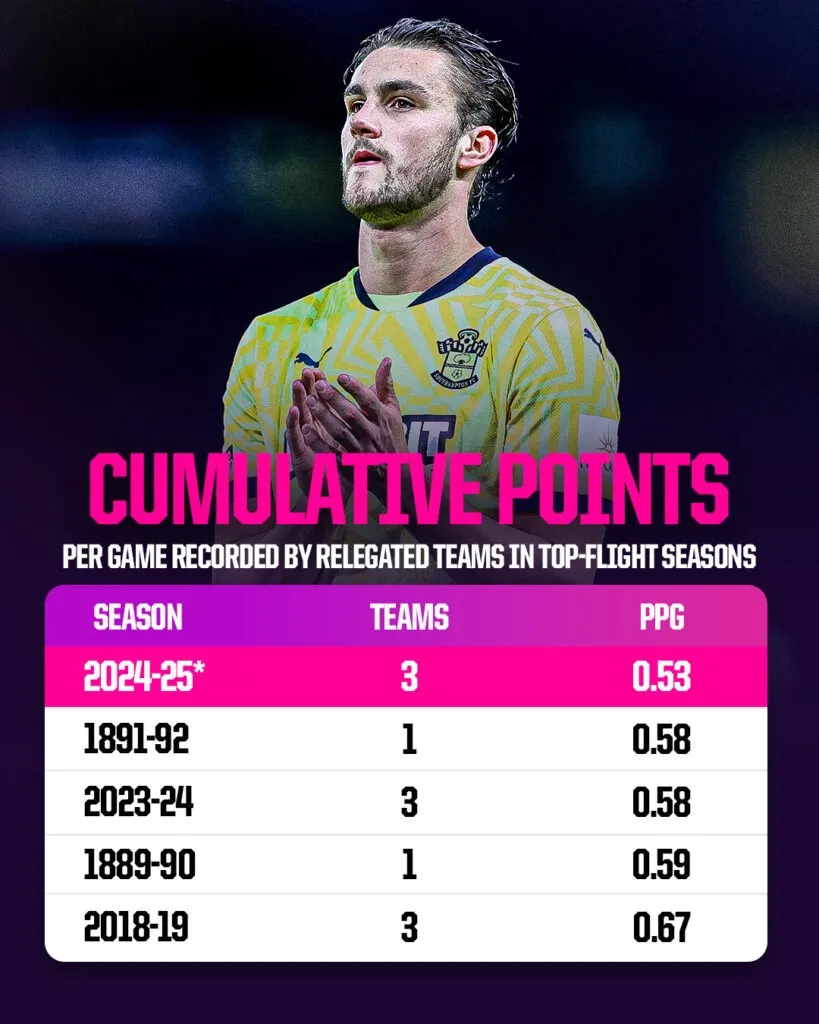 Sau vòng đấu thứ 27 của Premier League 2024-25, ba đội trong khu vực xuống hạng đang có tổng điểm trung bình chỉ 0,53 điểm mỗi trận. Nếu họ duy trì tỷ lệ này từ giờ đến cuối mùa giải, đây sẽ là tổng điểm trung bình thấp nhất trong lịch sử các đội xuống hạng tại giải đấu hàng đầu.