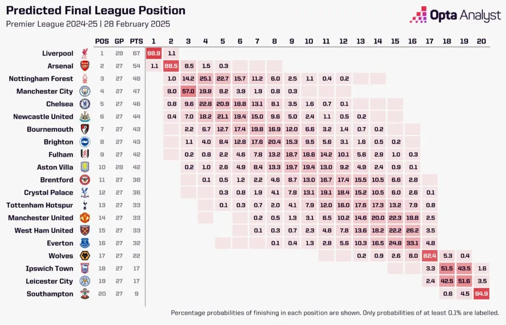 Leicester City đã thua West Ham 0-2 một cách dễ dàng vào thứ Năm, đánh dấu thất bại thứ 11 của đội bóng này trong 12 trận gần nhất tại Premier League. Điều này đồng nghĩa với việc khoảng cách giữa khu vực xuống hạng và an toàn vẫn là năm điểm, với Wolves đứng thứ 17, vượt lên trên Ipswich và Leicester, cả hai đều có 17 điểm. Southampton dường như đã hết hy vọng khi đứng chót bảng với chỉ chín điểm, và đội bóng của Ivan Juric đã bị siêu máy tính Opta dự đoán xuống hạng 100%.