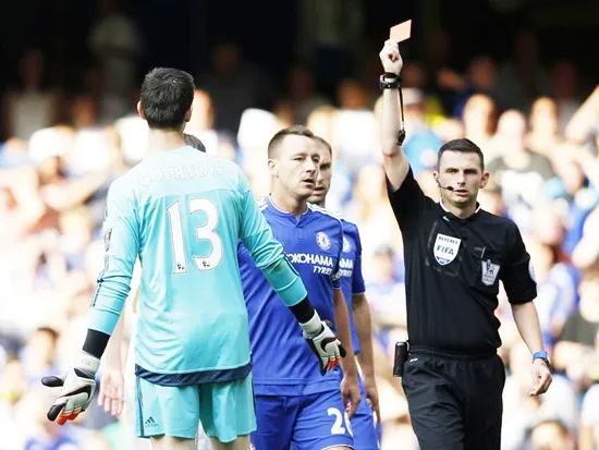 Trọng tài Michael Oliver không ngần ngại rút thẻ đỏ truất quyền thi đấu thủ môn Courtois của Chelsea. Ảnh: Sportinglife