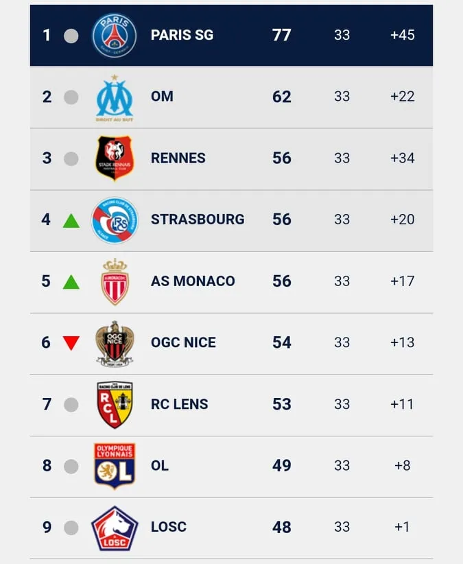 Sau vòng 33, Rennes vẫn đứng thứ 3, xếp sau lần lượt là Strasbourg, Monaco, Nice và Lens. Với 3 vị trí bằng điểm và 2 vị trí xếp sau chỉ kém từ 2 đến 3 điểm, cuộc đua dự Champions League ở Ligue 1 đang rất hấp dẫn. Bên cạnh đó, tấm vé dự Europa League hay Europa Conference League chắc chắn còn đang đợi chủ. Dù ngôi vương sẽ sớm được định đoạt, Ligue 1 vẫn rất gay cấn với hành trình dự cúp châu Âu mùa sau của các đội bóng.